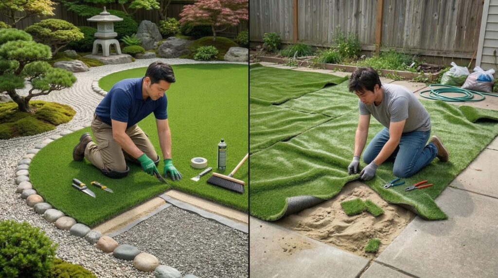 DIY施工で最も多い問題は、継ぎ目の処理と固定の甘さです。継ぎ目が浮いていたり端部の固定が不十分だと、走り回る子供がつまずいて転倒する危険があります。たとえば、整地が甘くて土台が沈んでいると、雨のたびに水たまりができてしまい、水遊びどころか日常的に使えない庭になってしまうこともあります。